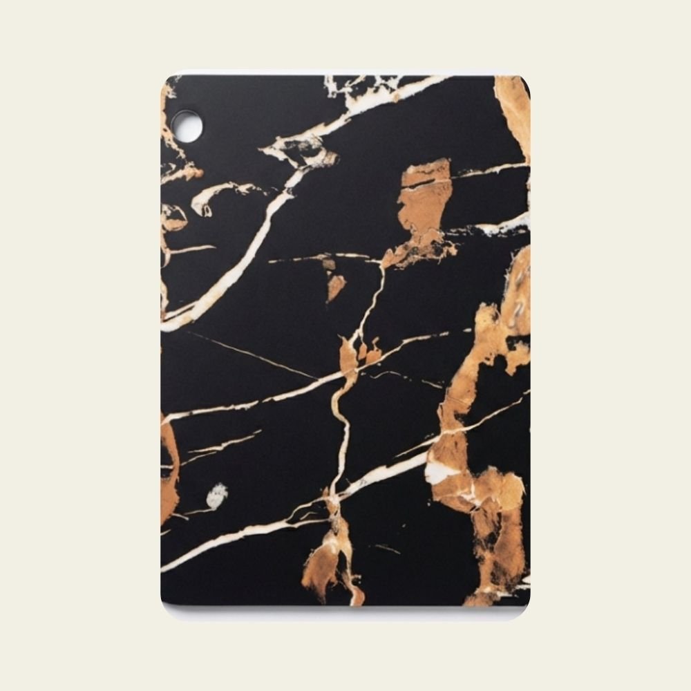 Nhựa vân giả đá PVC PN18 được thiết kế lấy cảm hứng từ các dòng đá marble cao cấp với nền đen tuyền chủ đạo, điểm xuyết hệ vân đá trắng và ánh vàng đồng nổi bật. Các đường vân chạy ngẫu nhiên, có độ đậm nhạt rõ ràng, tạo chiều sâu thị giác và cảm giác mạnh mẽ, quyền lực cho bề mặt vật liệu.